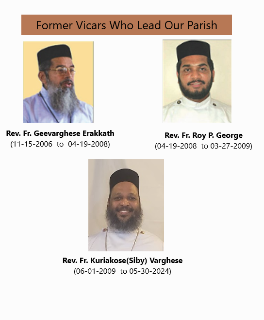 Father Geevarghese Erakkath, was appointed as the first Vicar by the Kalpana No.K80/2006 with effect from November 15, 2006. His Grace Mathews Mar Barnabas, Diocesan Metropolitan, blessed the church and celebrated the Holy Qurbana on November 25, 2006 and there after made the declaration of the formation of the congregation.